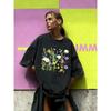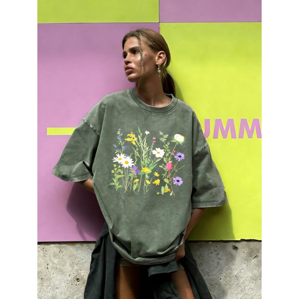 Various Flowers And Green Leaves Design Washed T-Shirt Women Cotton Vintage Short Sleeves Sportswear Summer T Shirt