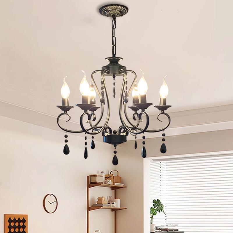 Retro Candle Pendant Light, Living Room Light, Dining Room Bedroom, Simple Rustic Style, Wrought Iron Black Crystal Lighting Fixture