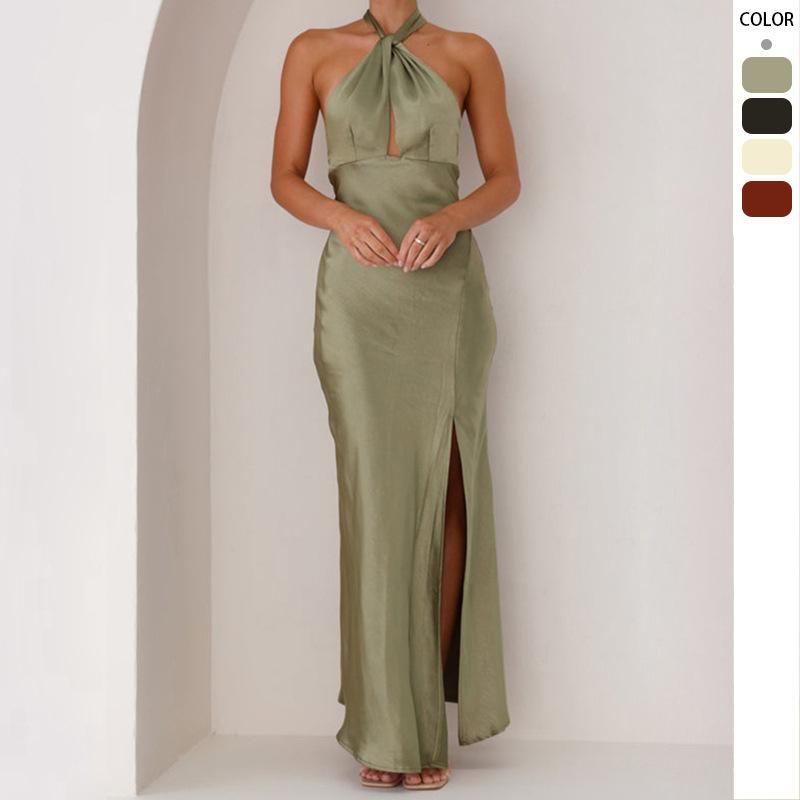 Spring and summer new women's clothing sexy waist hanging neck split long satin sleeveless dress women
