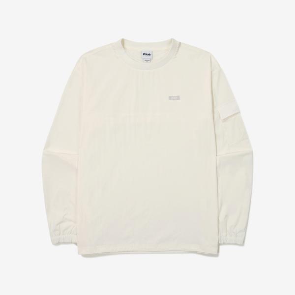 The FILA Stretch Woven Pocket Sweatshirt is made from a nylon and polyurethane blend, providing excellent elasticity and comfort. It features a stylish ivory color and includes a practical pocket. This item has a slightly wider silhouette than regular men's t-shirts, emphasizing comfort.