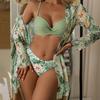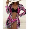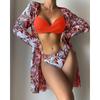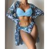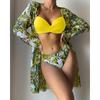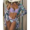 Dámská sada bikin s květinovým potiskem Sexy třídílná plážová pokrývka nahoru Push Up Léto s dlouhým rukávem Twist plavky