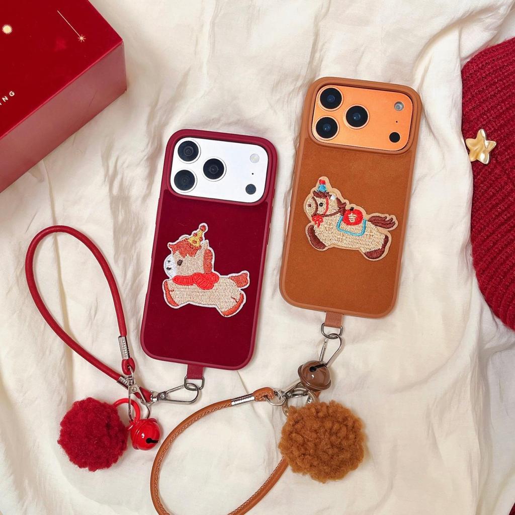 Embroidery Horse Case with Hand Strap & Fur Ball for iPhone 14/15/16/17 Pro Max & Huawei