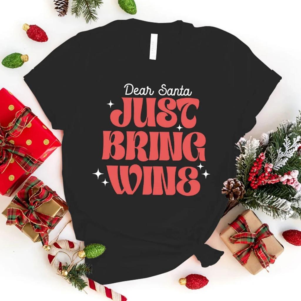 New Christmas Dear Santa Just Bring Wine Print T Shirt Women Men Short Sleeve Tops Tees Fashion Loose Casual T-Shirt