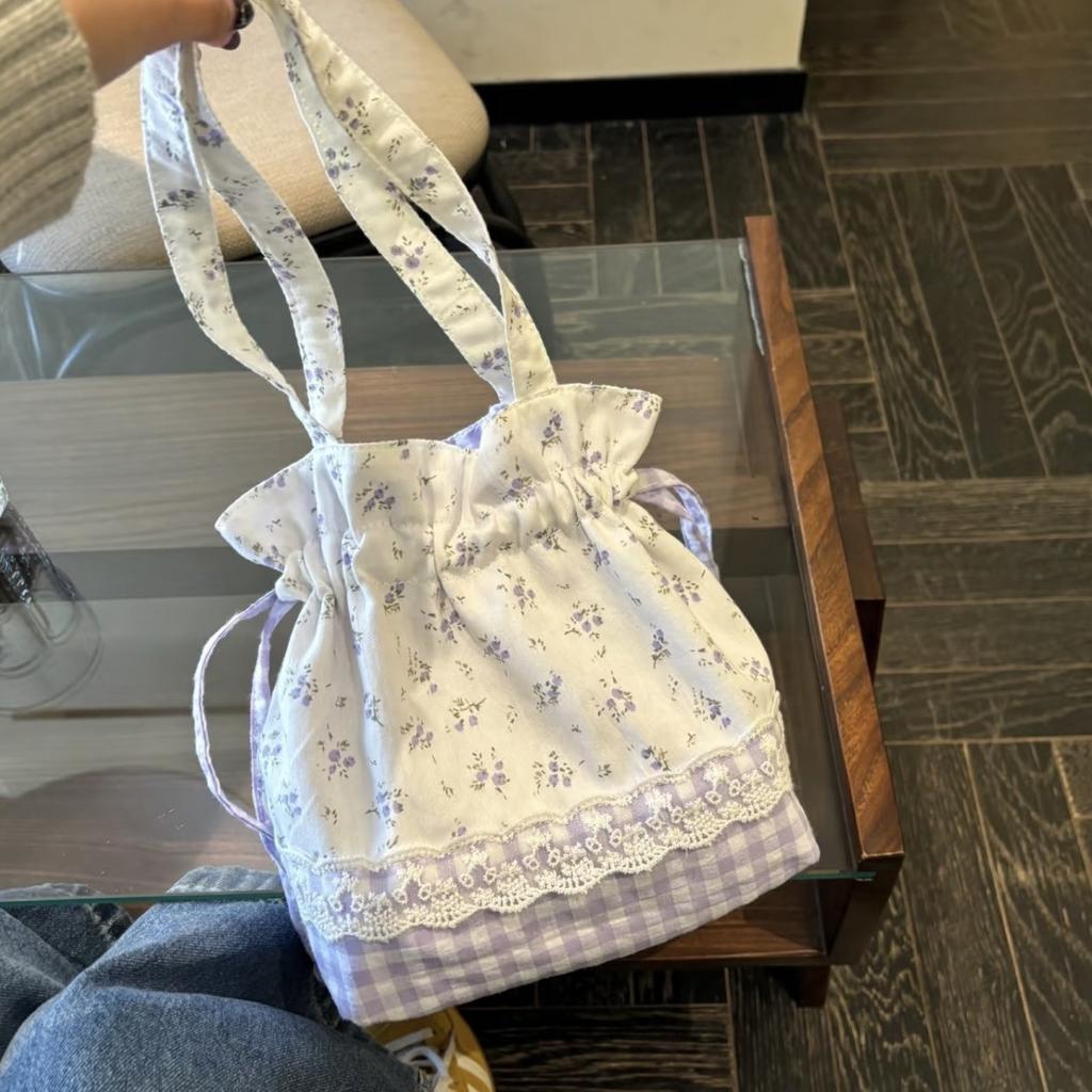 Floral Plaid Lace Women's Drawstring Shoulder Bags Student Commuter Ladies Tote Handbags Large Capacity Portable Girl Lunch Bag