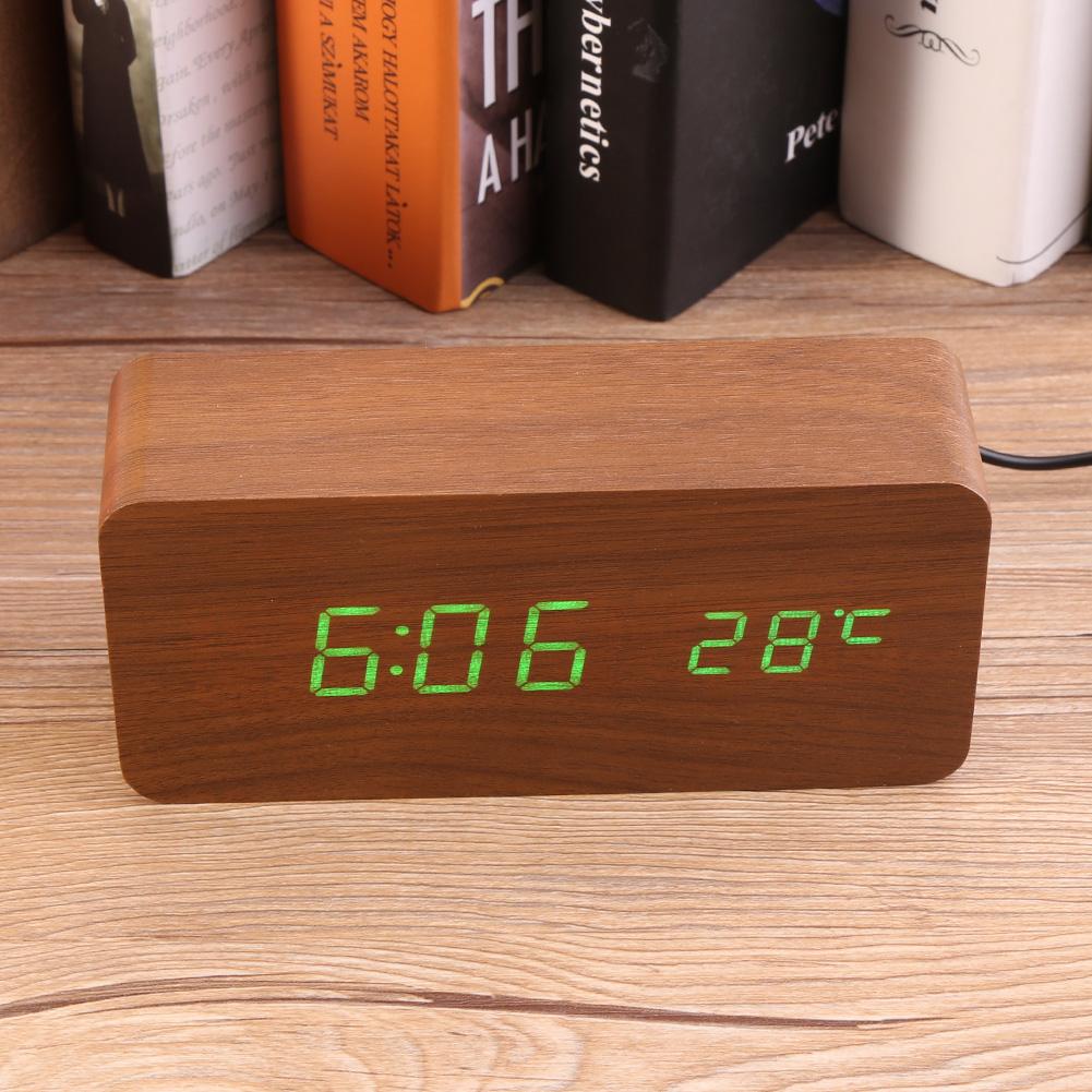 This item is made of wooden material, very nice looking, perfect for your home improvement not only an alarm clock but a desk decoration for modern life. Multi-functional clock, it features alarm settings, temperature and time display. It can be plugged in via USB or powered by 3 batteries, more convenient to use. size, convenient to carry. Portable design for home, , travel use. It also works in voice mode. Make some noise (clap your hands, on the table or pat the clock) nearby can wake it up.