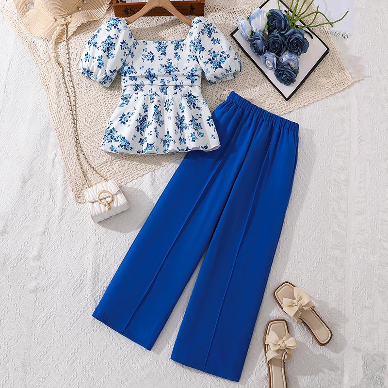 Módní modrá souprava pro dívky: Jarní/Letní Dětský Elegantní Top a Široké Kalhoty Dvoudílná Sada