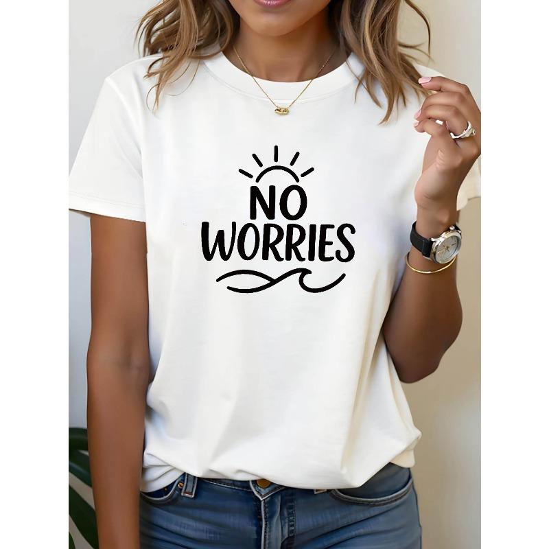 NO WORRIES Letter Print T-Shirt, Short Sleeve Crew Neck Casual Top for Summer & Spring, Women'S Clothing