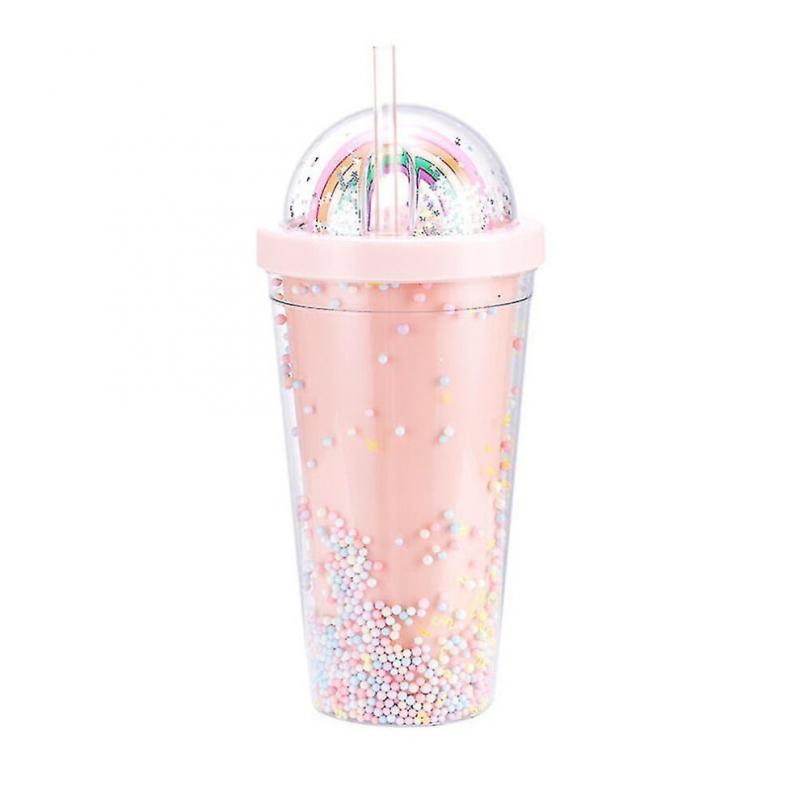 550ml Rainbow Plastic Water Bottle Double Layer Sequins Drinking Cup With Straw Women Girl Gift Pink