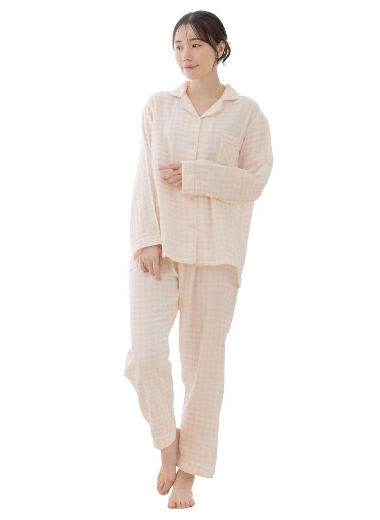 Cotton Double Gauze Pajamas for Front Long Sleeve Suitable for Sensitive Skin Soft and Comfortable Check Perfect for Hospital Stays and Breastfeeding