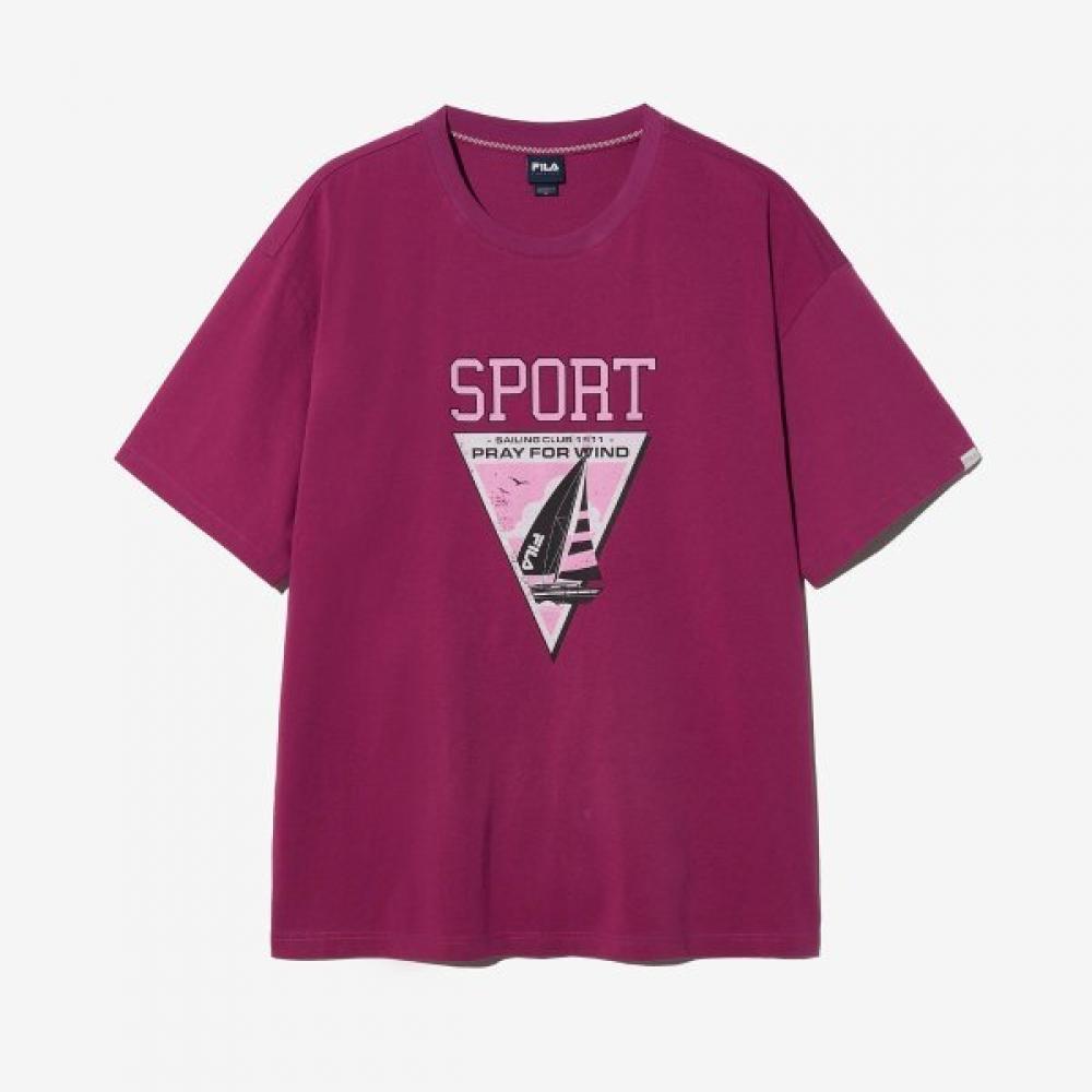 The Fila Sailing Vintage Short Sleeve T-Shirt features a graphic inspired by sailing and sports club moods. Its vintage graphic adds a trendy vibe. This design highlights vintage styles with the Sailing flag graphic. The color is Wine, with PLUM as the available option.
