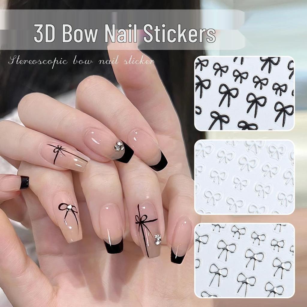 3D Bowknot Nail Stickers: Embossed Black, White, Silver Self-Adhesive Decals