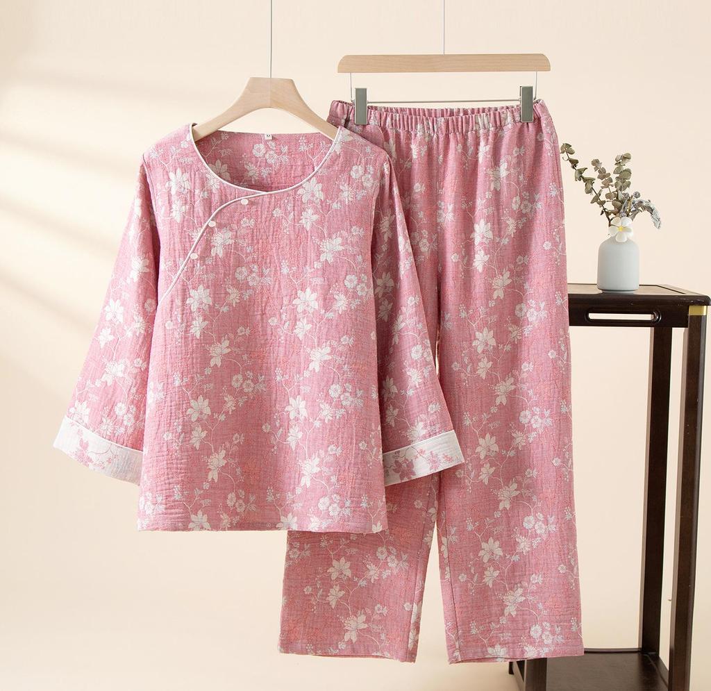 Women's Spring/Summer Red Jacquard Cotton-Linen Pajamas Set with Zodiac Design - Long Sleeve and Pants