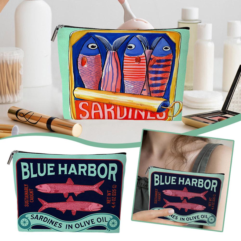 Cartoon Sardine Printed Makeup Bag Women Zipper Cosmetic Organizer Cloth Handbag Box Shape Portable Toiletry Case For Girls
