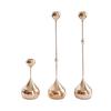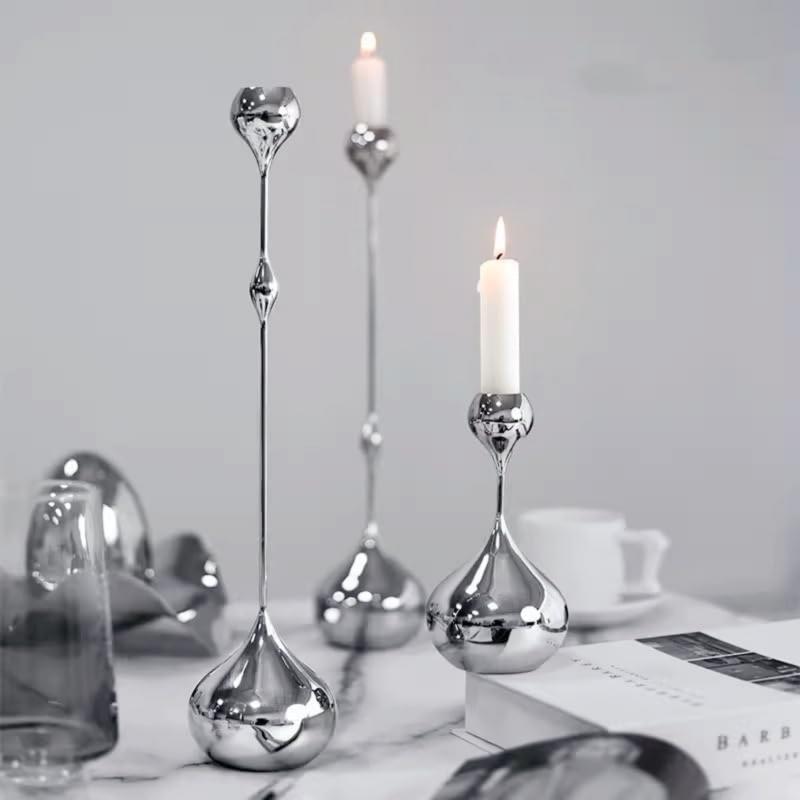 1. This 3-piece set of metal candle holders features a sleek, modern design with a teardrop-shaped base and slender stem, available in silver, black, and gold finishes to complement any home decor style.