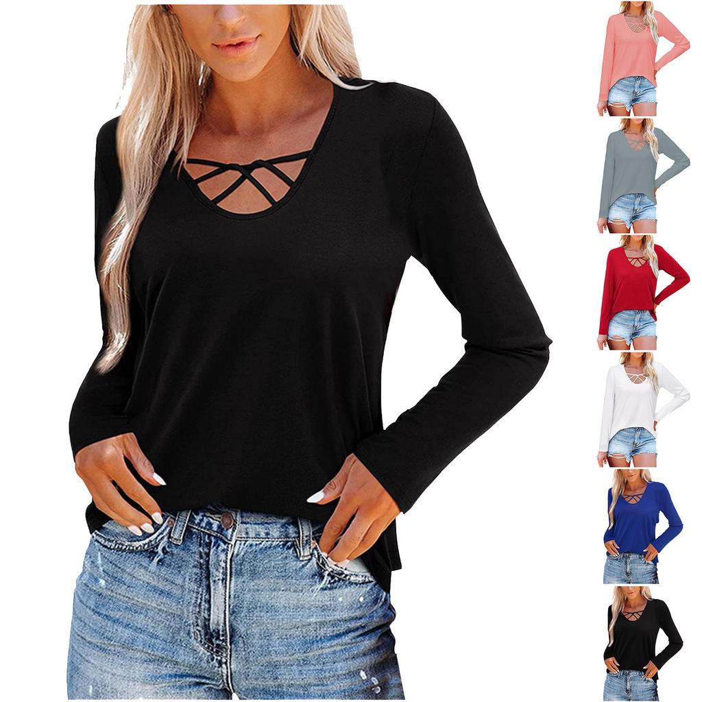 Women's Ladies Casual V-Neck Long Sleeve Slim Fit Pullover Color Women's T-Shirt Top
