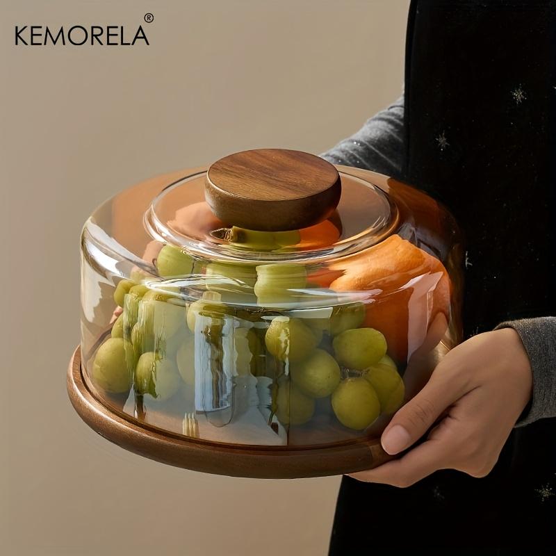 1PCS Round Wooden Cake Stand with Glass Dome Lid -Wood Serving Tray for Dim Sum Pastries & Desserts for Dining Room Cake Tray