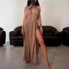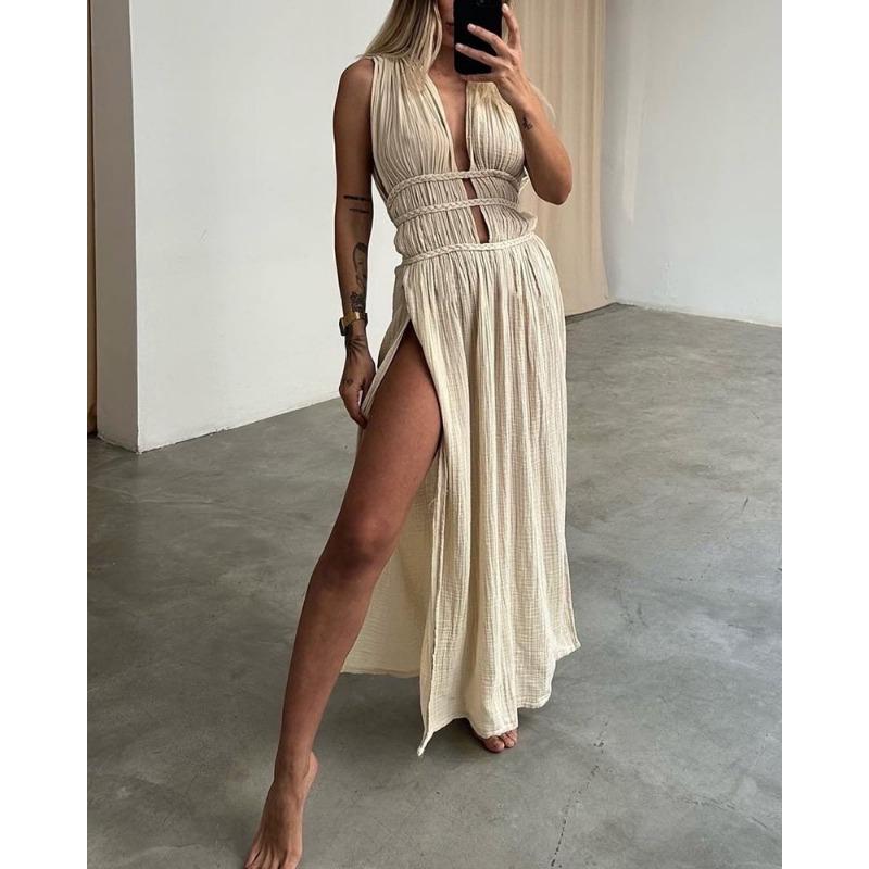 Dámská směs lnu v bohémském stylu s copem bez rukávů Dlouhé šaty s dutým rozparkem