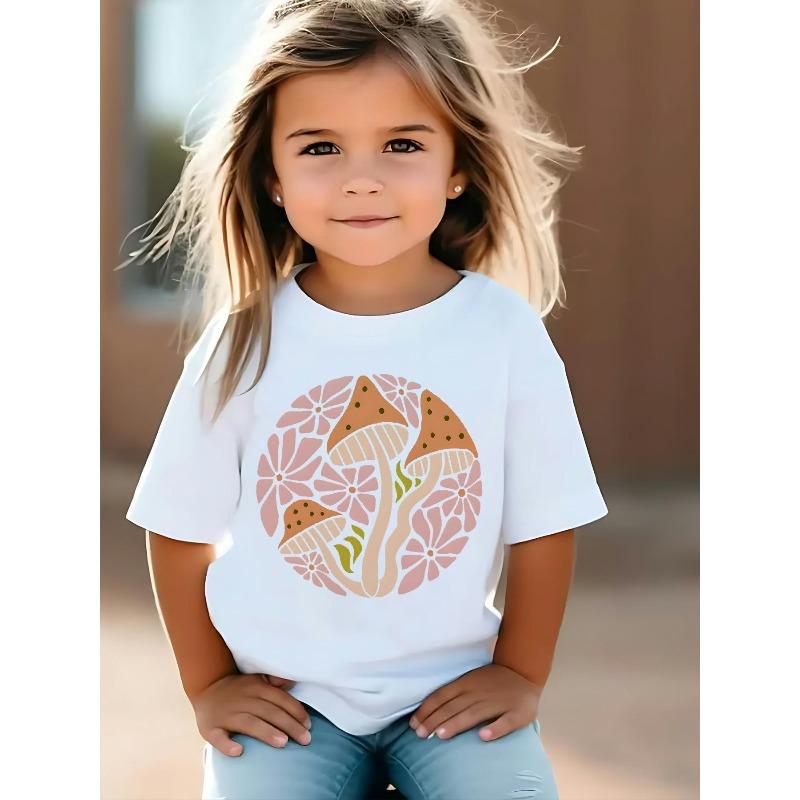 European sizes Adorable Mushroom And Flower Print | Stylish And Casual Crew Neck T-Shirt For Girls, Perfect For Summer And Holiday Gifts