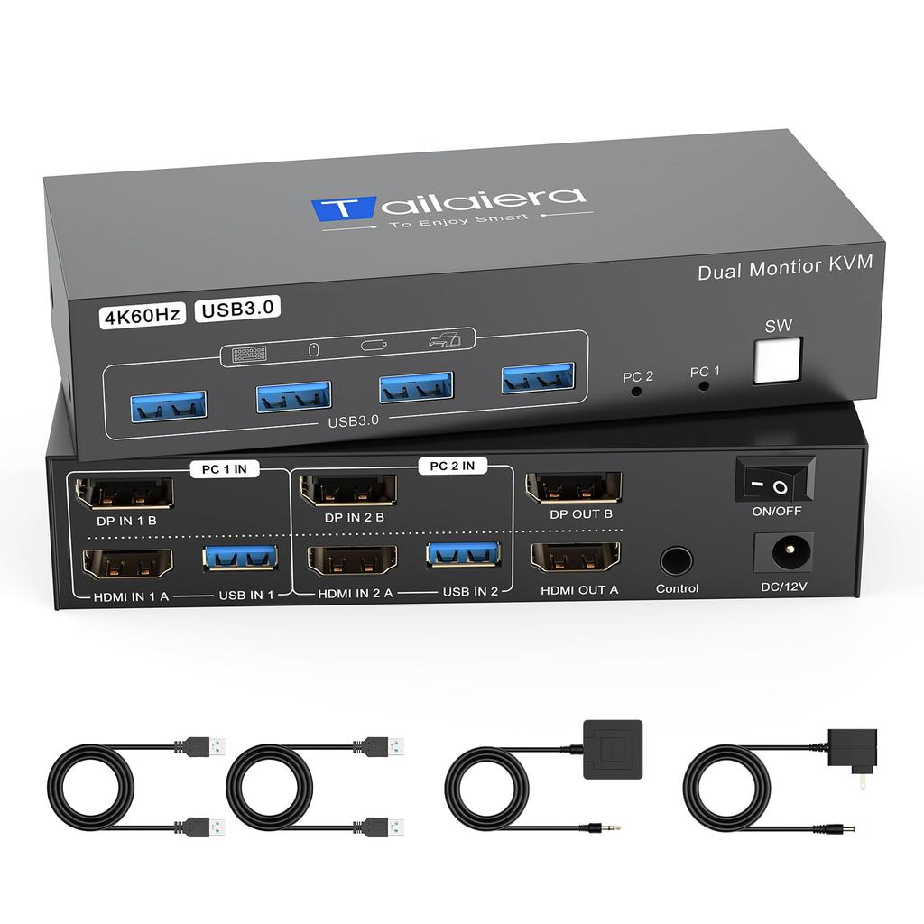 【Wide Compatibility and Driver-Free】: This USB switch supports Windows, macOS, and Linux systems. Plug and play. Compatible with most HDMI/DP source devices such as PCs, laptops, MacBook Pro, Mac mini, Switch, PS5, PS4, PS3, Xbox One, etc., the TAILAIERA KVM switch is widely applicable in businesses, offices, multimedia education, conference rooms, game rooms, research and testing, etc.