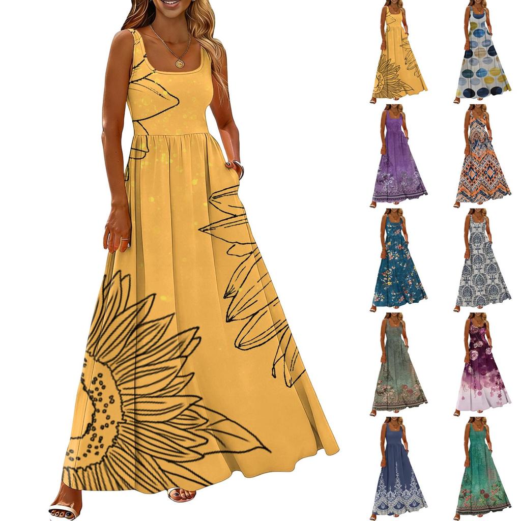 Ladies' floral print summer casual and fashionable sleeveless long dress