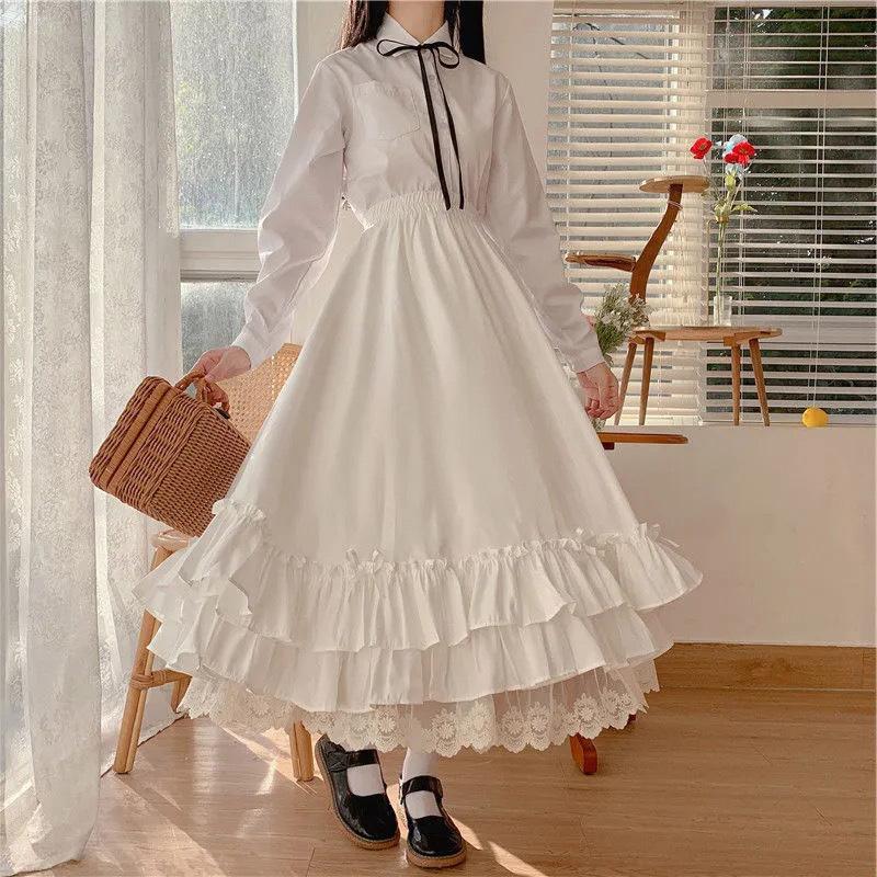 Korejský styl Černobílá Polosukně Dámská Dlouhé sukně Japonská Jednobarevná Dvouvrstvá Vintage Francouzská Volánová A-liniová Sukně