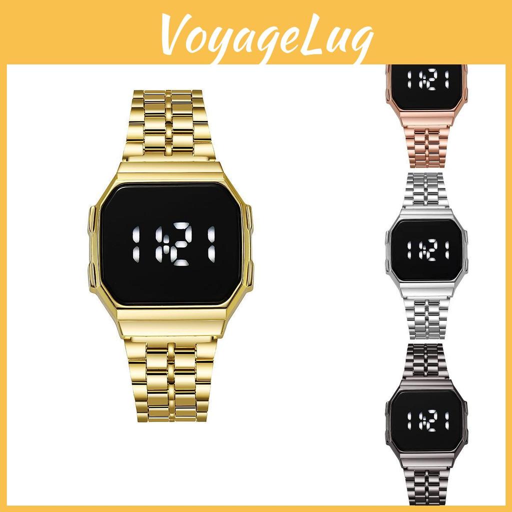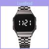 The F91 metal bracelet touch screen LED digital watch features a 34mm square alloy case with a plastic lens, delivering a sleek, modern look. Its electronic movement supports digital display, calendar, and 24-hour indicators, suitable for daily stylish wear. Not water-resistant, its ideal for casual, fashion-forward settings. Wipe clean with a soft cloth for maintenance.