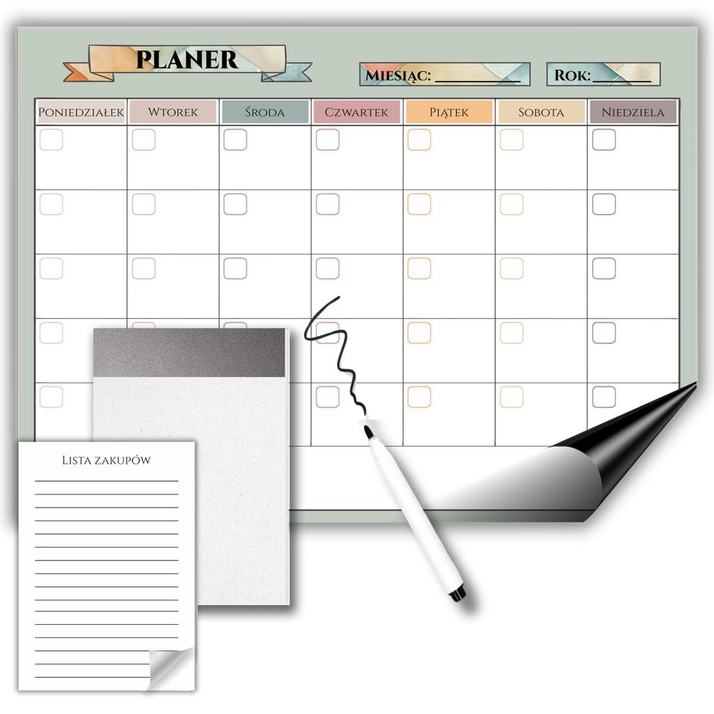 Co wyróżnia Nasz Magnetyczny Organizer? ▶ Najwyższa jakość wykonania– tablica pokryta jest laminatem, co chroni przed uszkodzeniami i zapewnia wyjątkową trwałość. Konkurencyje produkty często nie mają dodatkowej warstwy ochronnej, przez co szybko się niszczą.▶ Pełna Magnetyczna powierzchnia– wiele tablic dostępnych na rynku ma tylko cienkie paski magnetyczne, przez co mogą się przesuwać lub odpadać. Nasz planer przylega całą powierzchnią, zapewniając maksymalną stabilność i przyczepność. ▶ Powierzchnia suchościeralna- nasza tablica jest nie tylko magnetyczna, możesz również po niej pisać markerami suchościeralnymi lub kredowymi i bez problemu zmywać napisy.▶ Kompletny zestaw- PLANER + PISAK + NOTES - Nasz planer to nie tylko tablica magnetyczna, ale także praktyczny notes na zakupy z magnesem oraz marker suchościeralny z gąbką i magnesem. Dzięki temu cały zestaw zawsze pozostaje w jednym miejscu – na lodówce lub innej metalowej powierzchni.
