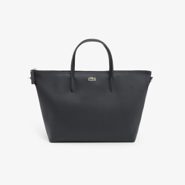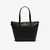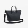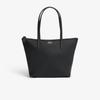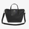 The Lacoste NF5324P56G L1212 NEW Tote Crossbody Bag - 000 Black JS features a compact design that can be styled as both a tote and a crossbody bag for women. It is distinguished by its clean black color and the brand's iconic crocodile logo, while its interior includes a zipper pocket and card slots for added practicality. The main closure is a zipper that securely holds your belongings.