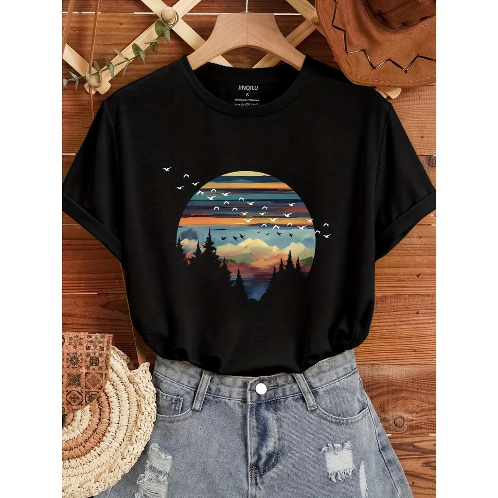 Women'S Casual Crew Neck T-Shirt with Scenic Landscape Print Short Sleeve Regular Fit Outdoor Adventure Style