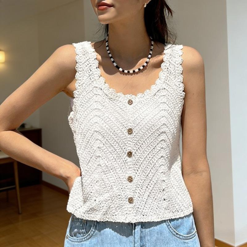 2026 New Korean Style Sweet Temperament Crochet Camisole Summer Vintage Solid Color Sleeveless Top Versatile Casual Vest for Women