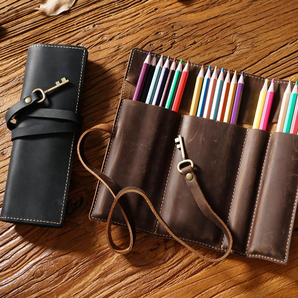 2026 Retro First-layer Cowhide Pen Curtain, Genuine Leather Pencil Case, Simple Literary Pencil Case, Multi-functional Bundle-tired Pencil Case