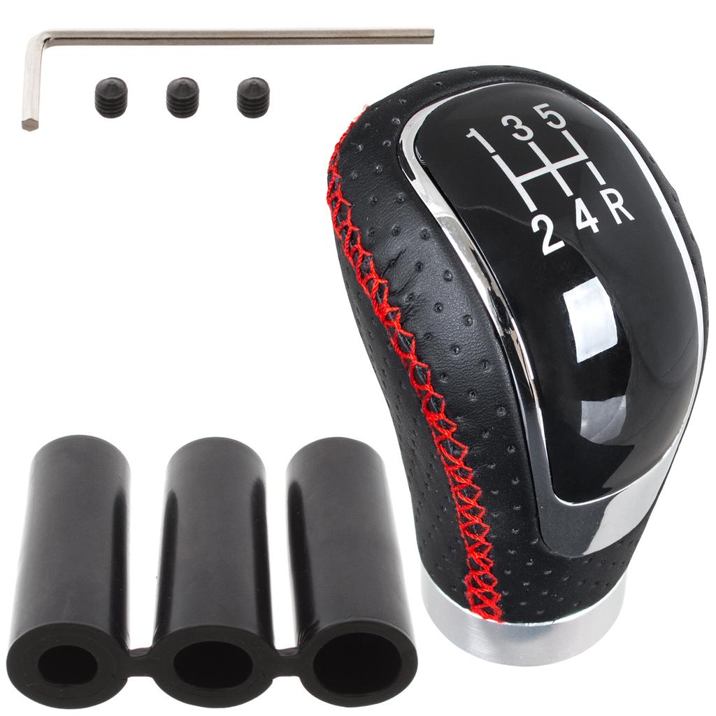 UNIVERSAL 5 SPEED BLACK LEATHER + RED THREAD + SILVER gear shift knob
