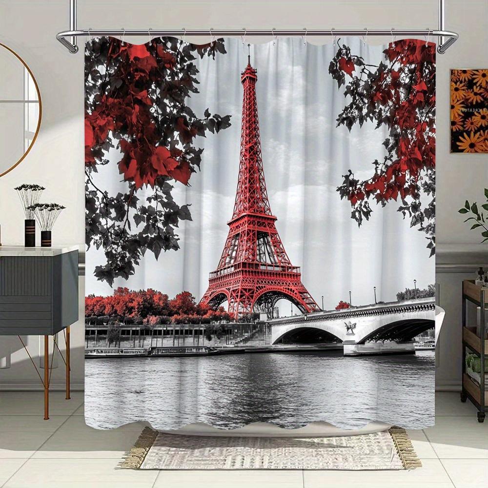 Paris Eiffel Tower Shower Curtain - Red Filtered Photo Art, Leafy Branches, Autumn Hues, Water-Resistant Polyester