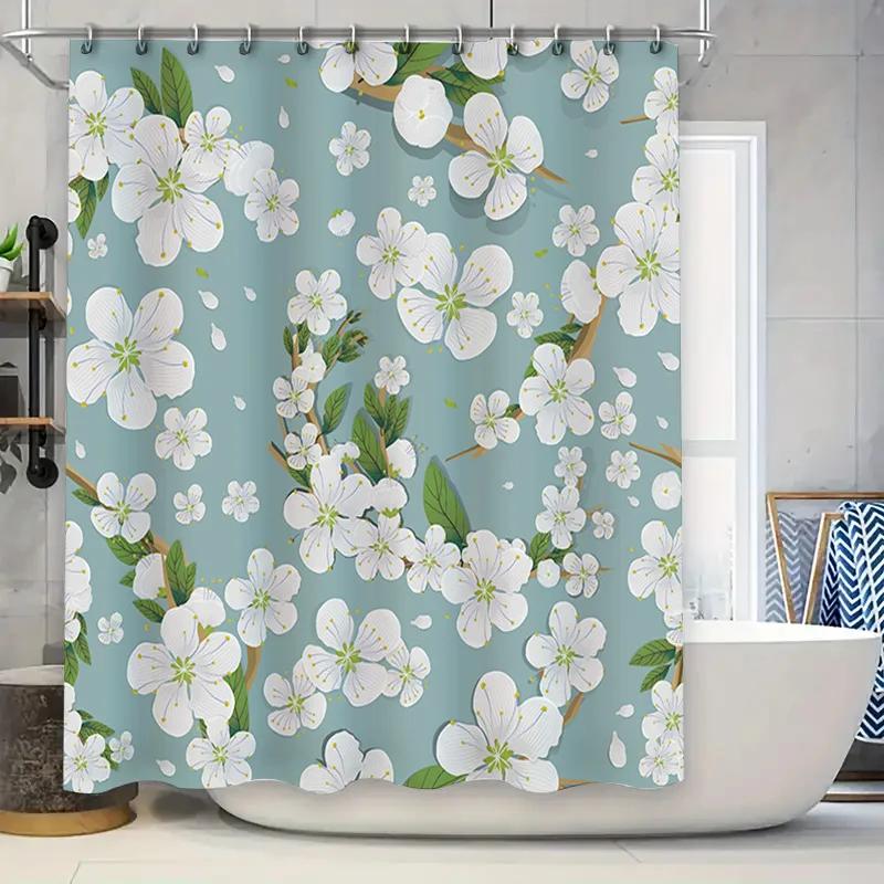 Cherry Blossom Shower Curtain Waterproof Bathroom Decorative Printed Fabric Shower Closures for Bathtubs Light Blue Color Patter