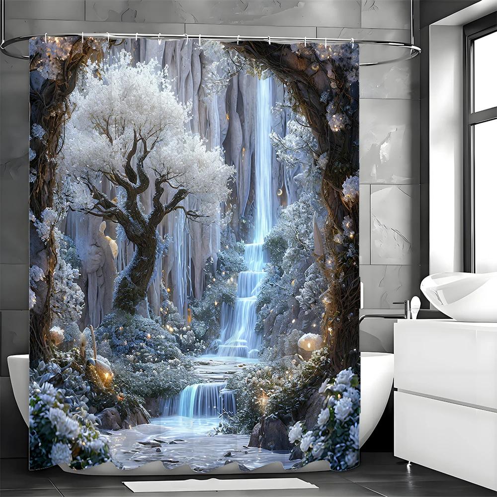 Vodopád Ledový svět Květina a strom Sprchový závěs, Koupelnový dekorativní sprchový závěs, Vodotěsný sprchový závěs s háčky