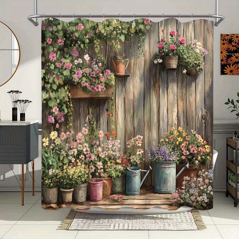 Whimsical Garden Shower Curtain - Colorful Flowers & Rustic Wooden Fence, Cottage-Themed Bathroom Decor