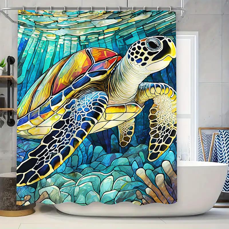 Handcrafted Tiled Turtle Shower Curtain Underwater Marine Life Artistic Decoration for Bathroom Blue Yellow White Patterned Fabr