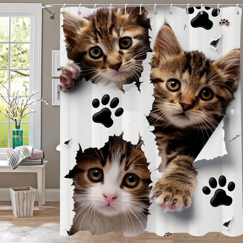1pc Creative and Interesting Cat with Holes Shower Curtain Bathroom Curtains With Hooks,Printed Curtain Home Decoration Curtain