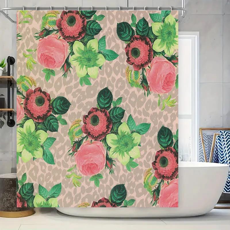 Bathroom shower curtain with floral pattern, pink rose design, leopard print background home decor accessories for bathroom