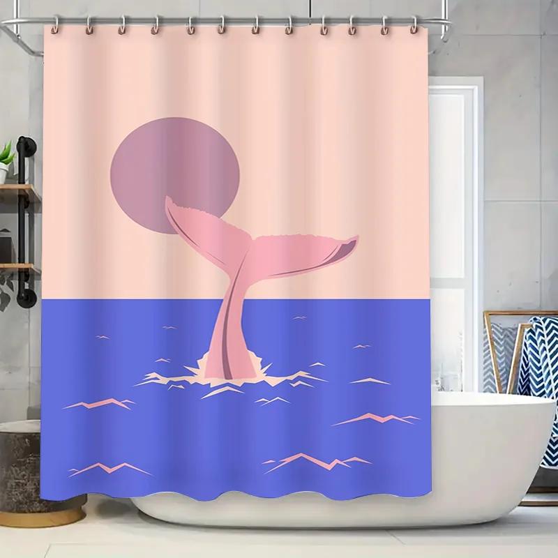 Modern Bath Shower Curtain Whale Tail Pink Blue Design for Bathroom Decor Waterproof Fabric with Hooks Set