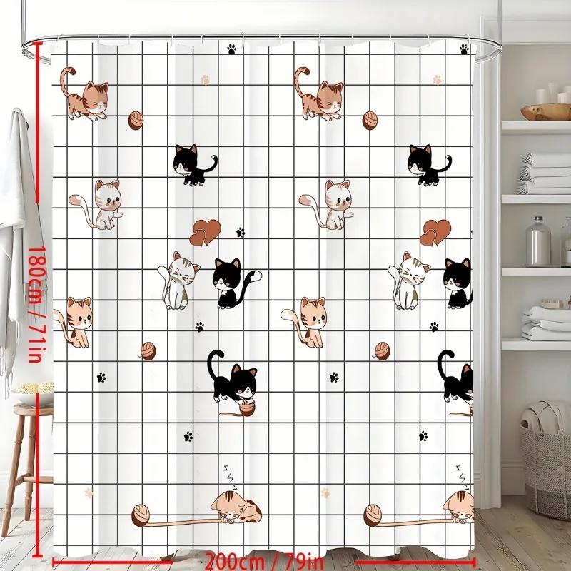 1pc Waterproof Cute Cat Pattern Shower Curtain - Easy Install with Hooks, Durable & Decorative for Any Bathroom