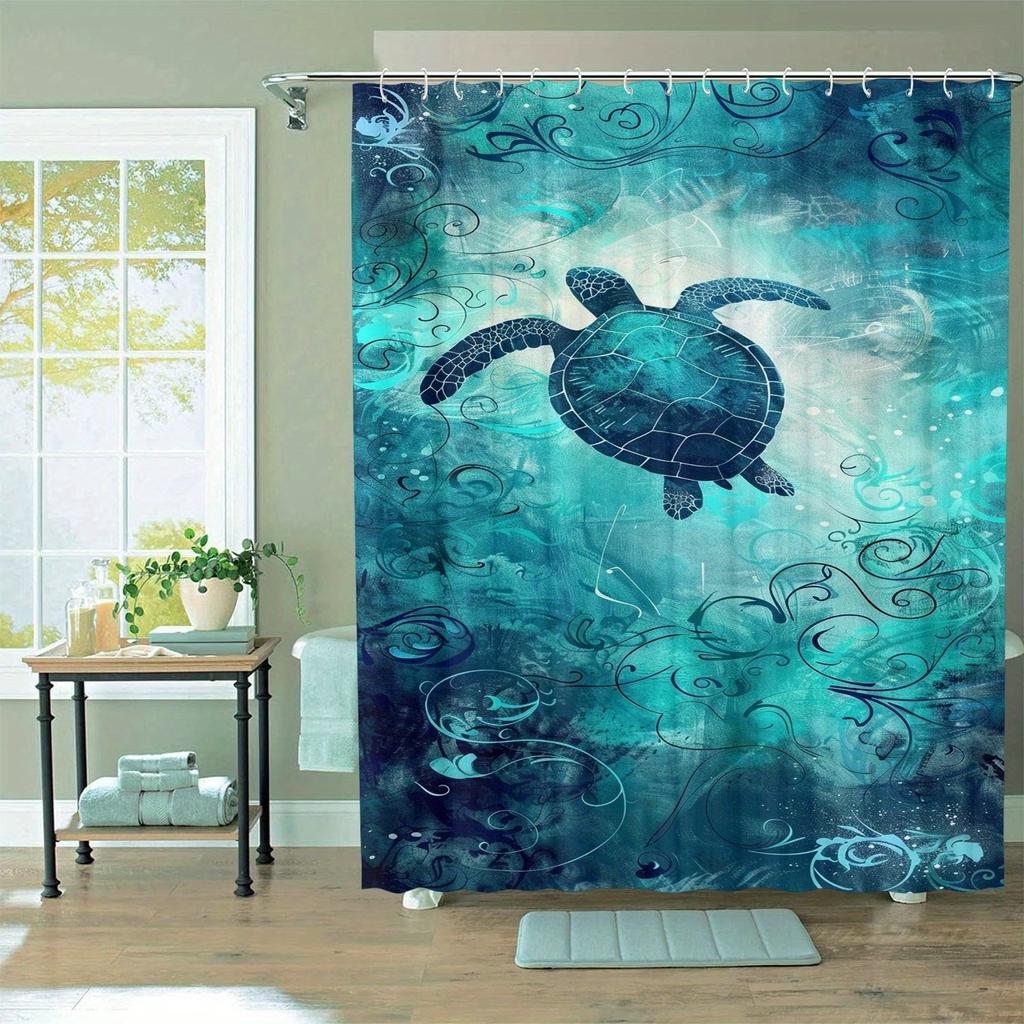 Waterproof Non-Woven Shower Curtain with Sea Turtle Pattern, Artistic Ocean Theme Bathroom Decor, with Hooks, Machine Washable