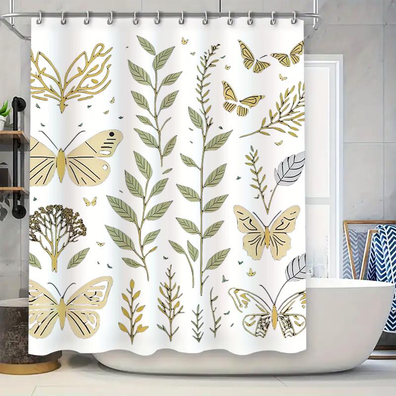 Delightful Floral Butterflies Shower Curtain 180 x 243cm Waterproof Home Decor for Bathrooms in Gold White Color Scheme Modern B