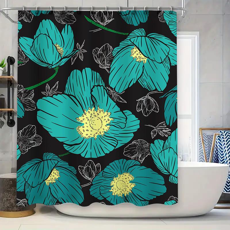 Stylish Blue Floral Shower Curtain for Bathroom Decor Waterproof Fabric with Hooks included in Set