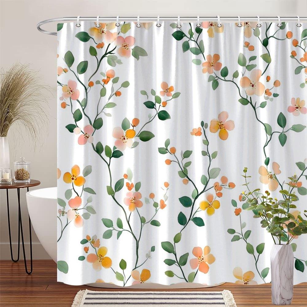 1 delicate orange and peach floral shower curtain, soft watercolor design, with hooks, polyester fabric, machine washable