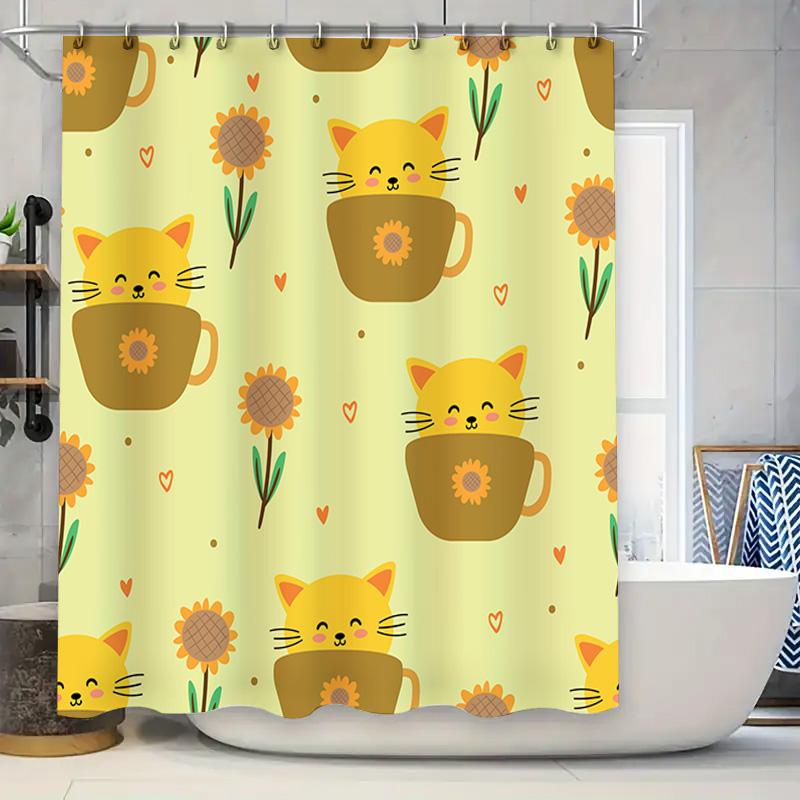 Cute Cat Cup Tea Towel Shower Curtain Home Decoration for Bathroom Waterproof Printing Washable (Yellow)