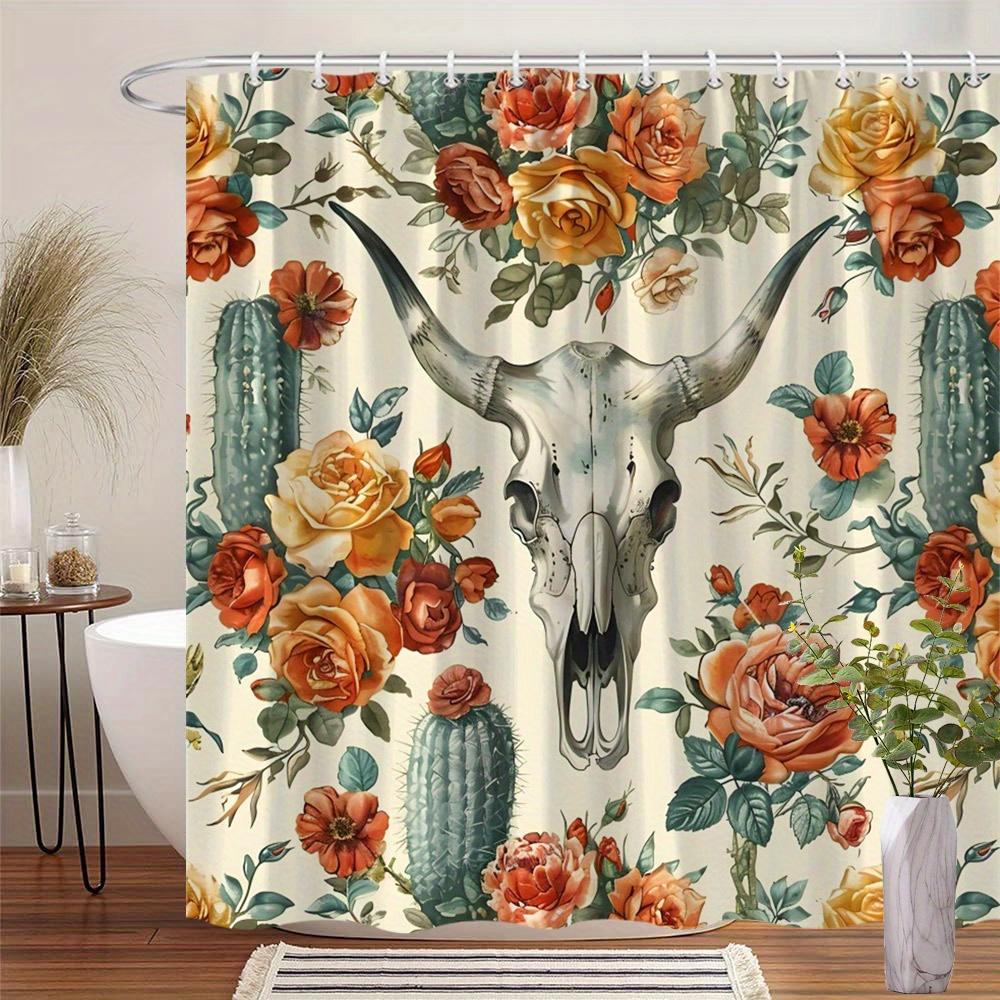 Southwest Elegant Shower Curtain - Bull Head Hanging Wall Decoration with Cactus and Flowers for Living Room and Bedroom