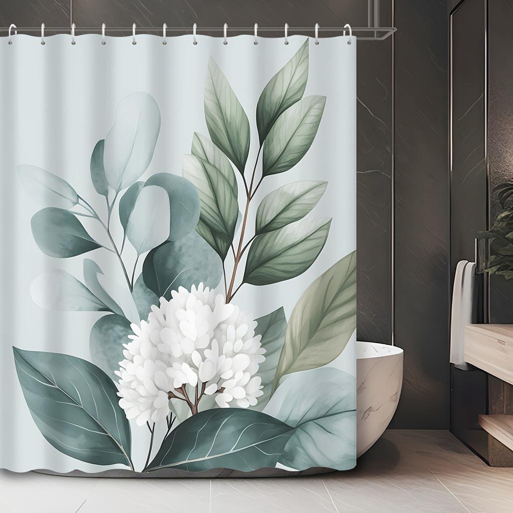 1pc Eucalyptus Leaf Greenery White Floral Shower Curtain, Printed Shower Curtain with Hooks, Polyester Fabric, Machine Washable