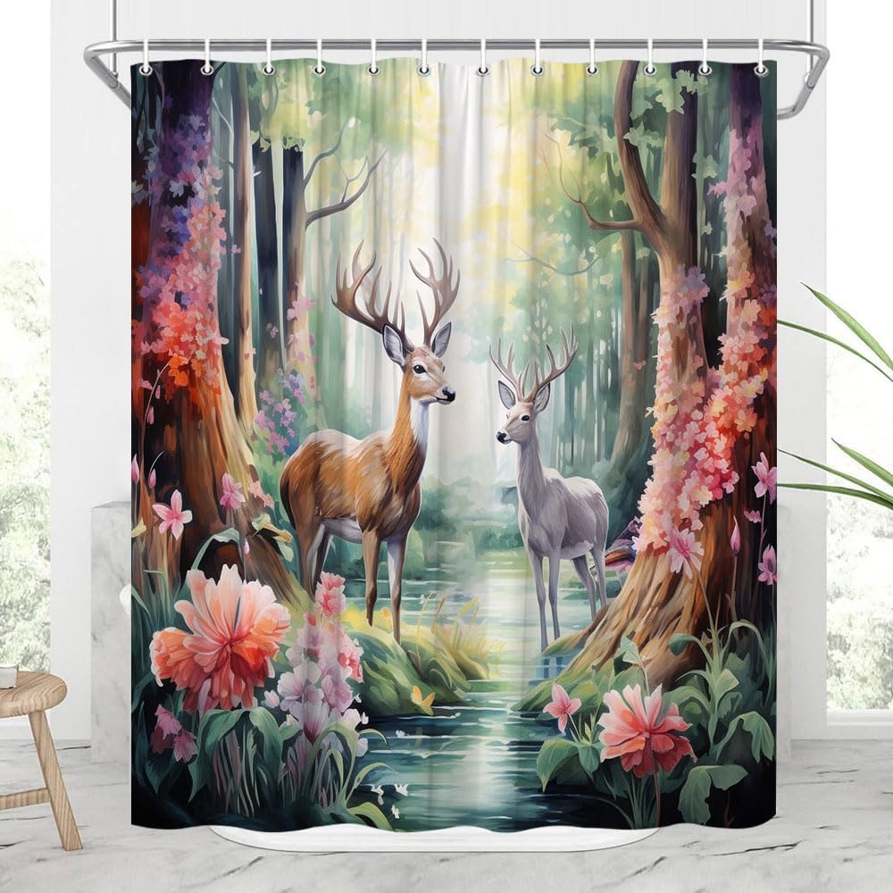 Forest Deer Shower Curtain Spring Farmhouse Animals Rustic Flowers Plants Leaves Green Tropics Rainforest Floral Landscapes