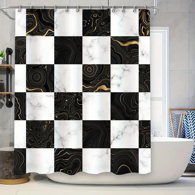 Modern Decorative Shower Curtain Set Waterproof Fabric Bathroom Decor Customizable Size Black White Gold Geometric Chevron Patte